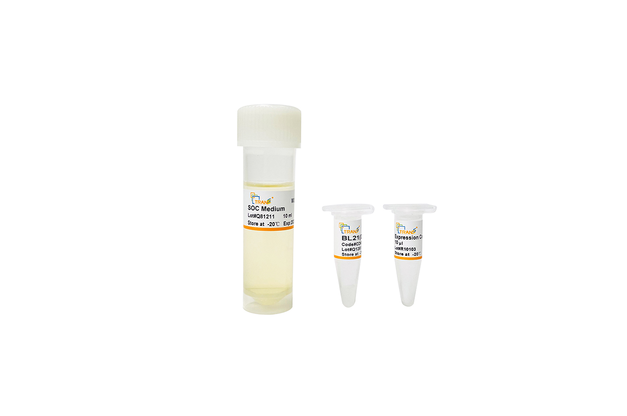 Trans BL21(DE3)化學(xué)感受態(tài)細(xì)胞經(jīng)特殊工藝制作,可用于DNA的化學(xué)轉(zhuǎn)化。使用pUC19質(zhì)粒DNA檢測,轉(zhuǎn)化效率高達(dá)107 cfu/μg DNA。使用Control Plasmid I (Amp+)用于檢測細(xì)胞是否具有表達(dá)功能,表達(dá)蛋白大小為25 kDa。
