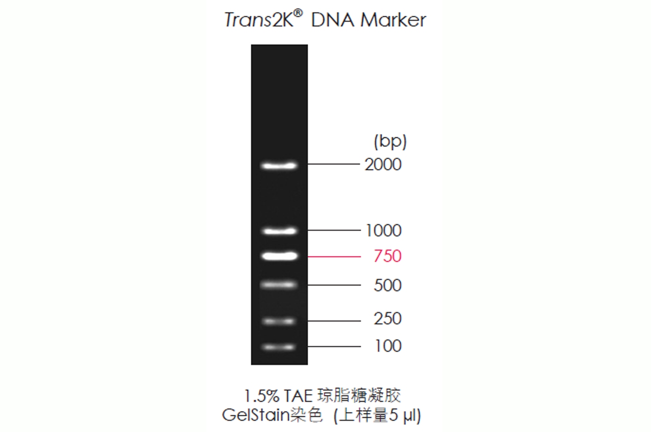 Trans2K? DNA Marker是由6條線狀雙鏈DNA條帶組成,適用于瓊脂糖凝膠電泳中DNA條帶的分析,不建議用于聚丙烯酰胺凝膠電泳。本產(chǎn)品為即用型產(chǎn)品,已含有1×Loading Buffer,可根據(jù)實驗需要,直接取5 μl電泳,使用方便, 電泳圖像清晰。其中750 bp條帶濃度為100 ng/5 μl,顯示亮帶,其余條帶濃度均為50 ng/5 μl。便于準確判斷目的產(chǎn)物DNA的量。