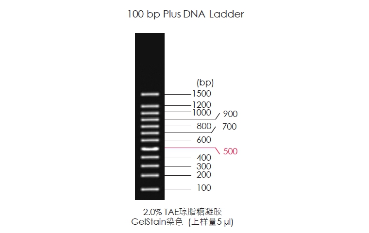 100 bp Plus DNA Ladder是由12條線狀雙鏈DNA條帶組成,適用于瓊脂糖凝膠電泳中DNA條帶的分析。本產(chǎn)品為即用型產(chǎn)品,已含有1×Loading Buffer,可根據(jù)實(shí)驗(yàn)需要,直接取5 μl電泳,使用方便,電泳圖像清晰。其中500 bp條帶濃度為100 ng/5 μl,顯示亮帶,其余條帶濃度均為50 ng/5 μl。便于準(zhǔn)確判斷目的產(chǎn)物DNA的量。