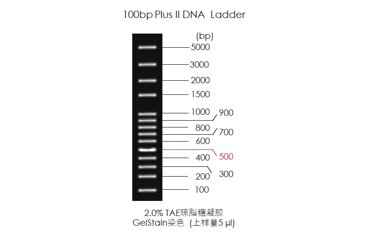 100 bp Plus II DNA Ladder是由14條線狀雙鏈DNA條帶組成,適用于瓊脂糖凝膠電泳中DNA條帶的分析。本產(chǎn)品為即用 型產(chǎn)品,已含有1×Loading Buffer,可根據(jù)實驗需要,直接取5 μl電泳,使用方便,電泳圖像清晰。其中500 bp條帶 濃度為100 ng/5 μl,顯示亮帶,其余條帶濃度均為50 ng/5 μl。便于準確判斷目的產(chǎn)物DNA的量。