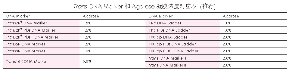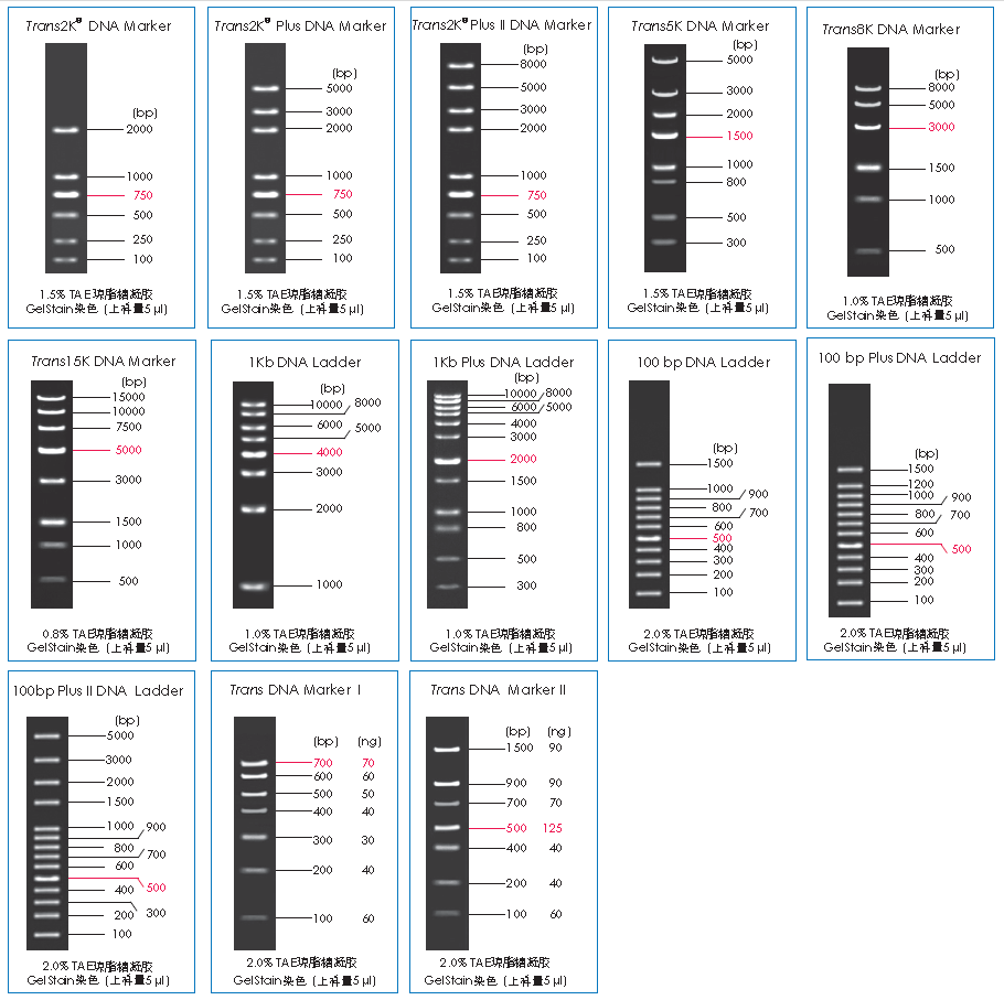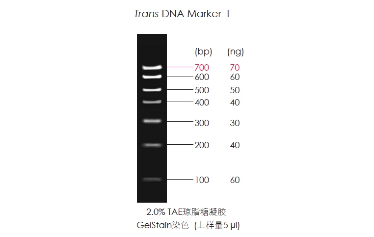 Trans DNA Maker I是由7條線狀雙鏈DNA條帶組成,適用于瓊脂糖凝膠電泳中DNA條帶的分析,不建議用于聚丙烯酰胺凝膠電泳。本產(chǎn)品為即用型產(chǎn)品,已含有1×Loading Buffer,可根據(jù)實驗需要,直接取5 μl電泳,使用方便,電泳圖像清晰。便于準確判斷目的產(chǎn)物DNA的量。