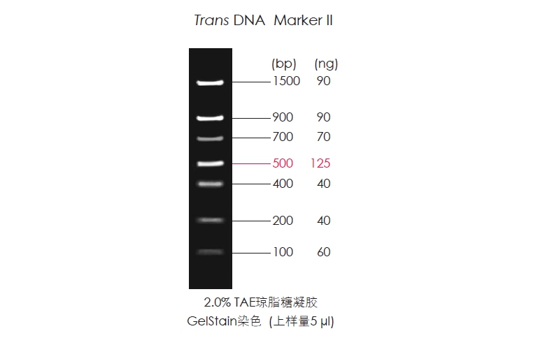 Trans DNA Maker II由7條線狀雙鏈DNA條帶組成,適用于瓊脂糖凝膠電泳中DNA條帶的分析,不建議用于聚丙烯酰胺凝膠電泳。本產(chǎn)品為即用型產(chǎn)品,已含有1×Loading Buffer,可根據(jù)實驗需要,直接取5 μl電泳,使用方便,電泳圖像清晰。便于準確判斷目的產(chǎn)物DNA的量。