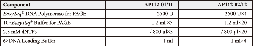 EasyTaq? DNA Polymerase for PAGE是從克隆有Thermu aquaticus DNA Polymerase基因的載體,在大腸桿菌中經(jīng)誘導(dǎo)表達(dá)、分離純化而成,其分子量為94 kDa。EasyTaq? DNA Polymerase for PAGE具有5'→3' DNA聚合酶活性和5'→3'外切酶活性,無(wú)3'-5'外切酶活性。EasyTaq? DNA Polymerase for PAGE 配有特殊的緩沖液,其PCR產(chǎn)物適用于聚丙烯酰胺凝膠電泳與瓊脂糖凝膠電泳。