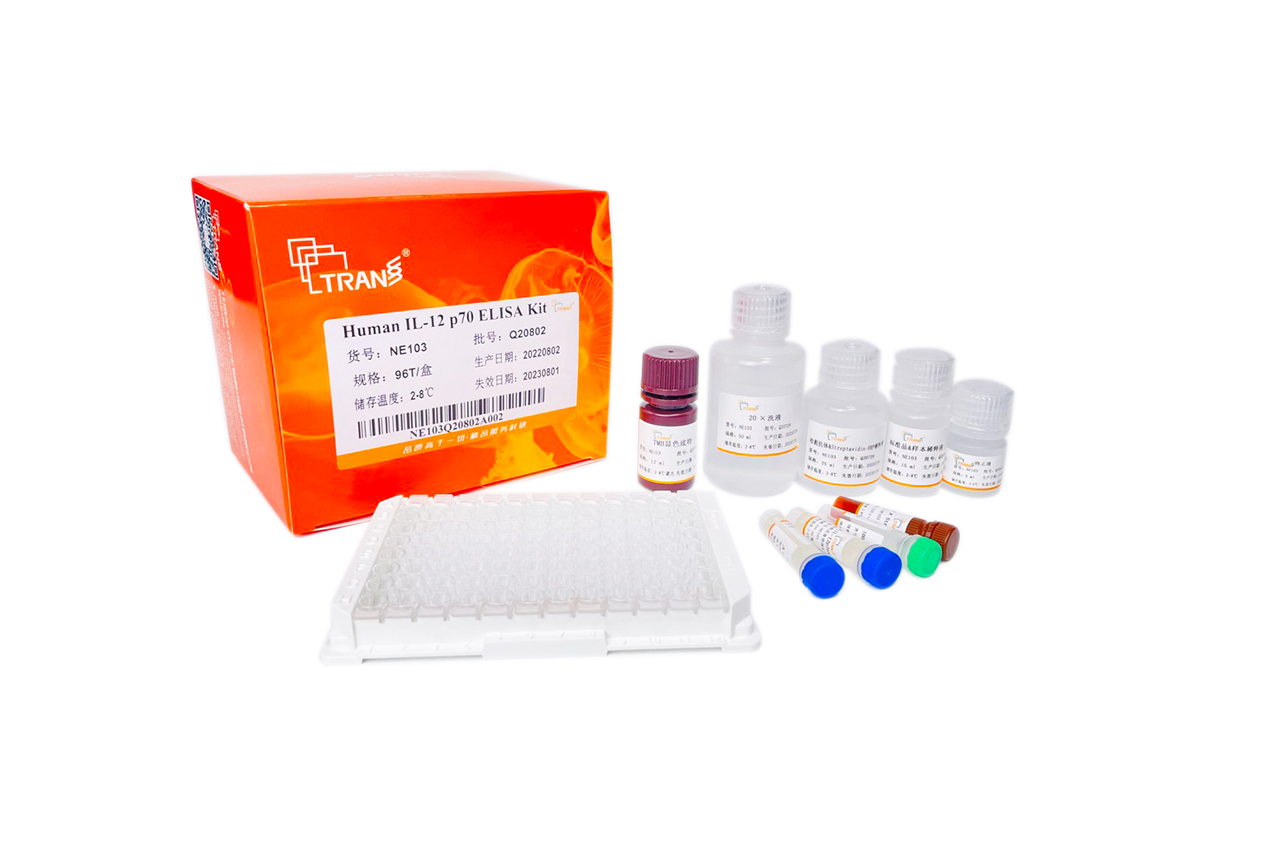 本試劑盒采用雙抗體夾心ELISA法定量測(cè)定人血清和血漿中的IL-12 p70含量。本試劑盒采用高親和力的抗人IL-12 p70抗體預(yù)包被酶標(biāo)板,將標(biāo)準(zhǔn)品/待測(cè)樣本加入微板孔中,經(jīng)過(guò)孵育后樣本中存在的IL-12 p70會(huì)與酶標(biāo)板上的預(yù)包被抗體特異性結(jié)合。洗滌去除未結(jié)合物后,將生物素標(biāo)記的抗人IL-12 p70檢測(cè)抗體加入微板孔中,再次孵育后檢測(cè)抗體會(huì)與錨定在酶標(biāo)板上的IL-12 p70特異性結(jié)合。隨后,將辣根過(guò)氧化物酶標(biāo)記的鏈霉親和素(Streptavidin-HRP)加至微孔板中并孵育,通過(guò)檢測(cè)抗體上的生物素和鏈霉親和素發(fā)生的高強(qiáng)度非共價(jià)結(jié)合,形成“包被抗體-人IL-12 p70蛋白-檢測(cè)抗體-Streptavidin-HRP”免疫復(fù)合物。再次洗滌后,將顯色底物TMB加至微板孔中,HRP會(huì)催化TMB底物生成藍(lán)色產(chǎn)物,顏色反應(yīng)的深淺將與樣本中IL-12 p70的濃度成正相關(guān)。而后加入終止液終止反應(yīng),在450 nm波長(zhǎng)(參考波長(zhǎng)570 - 630 nm)處測(cè)定吸光度值。通過(guò)繪制標(biāo)準(zhǔn)曲線(xiàn),由樣本吸光度值可計(jì)算出樣本中所含IL-12 p70濃度。本試劑盒特異性強(qiáng)、檢測(cè)靈敏度高,同時(shí)操作更加便捷。