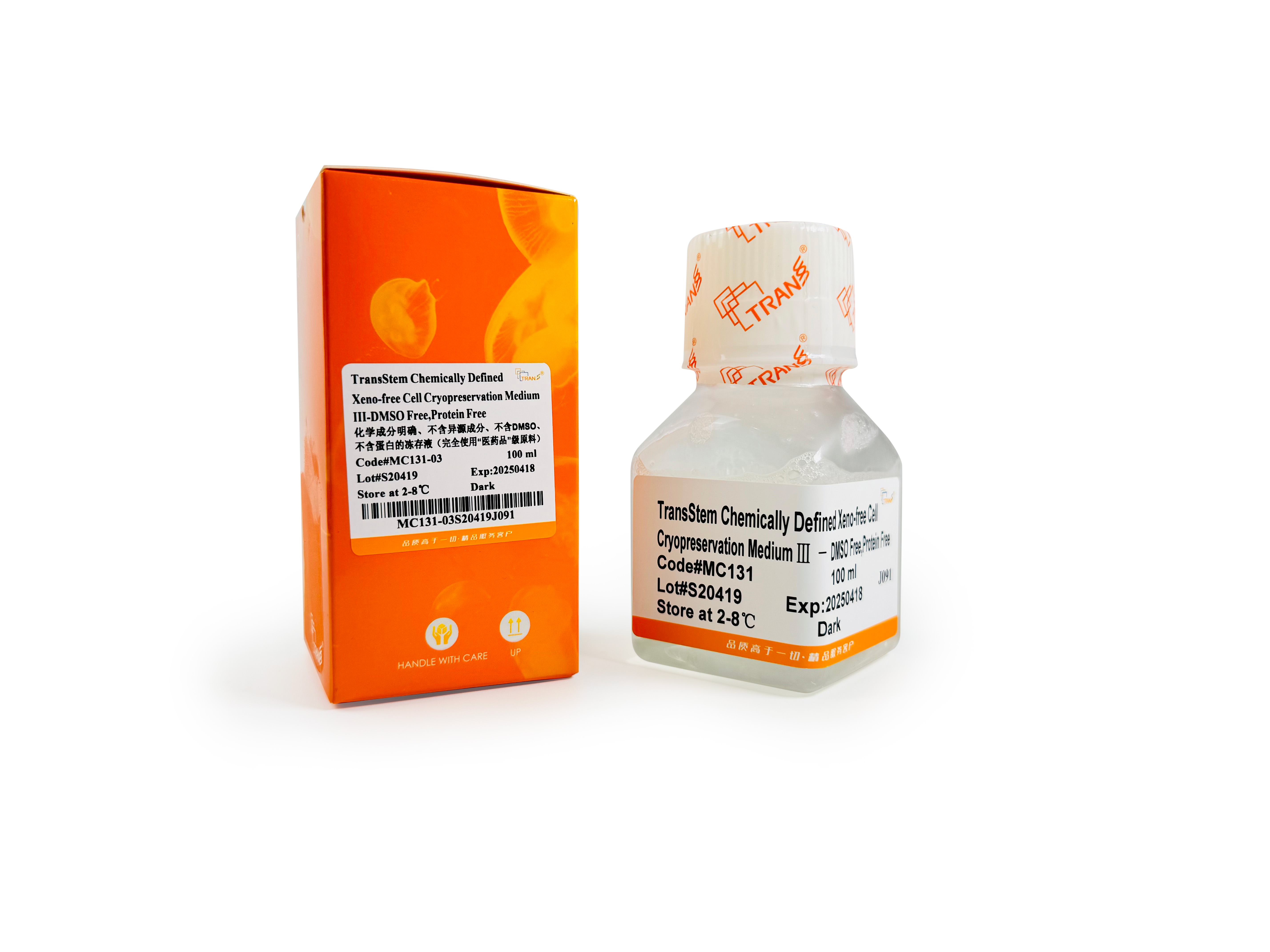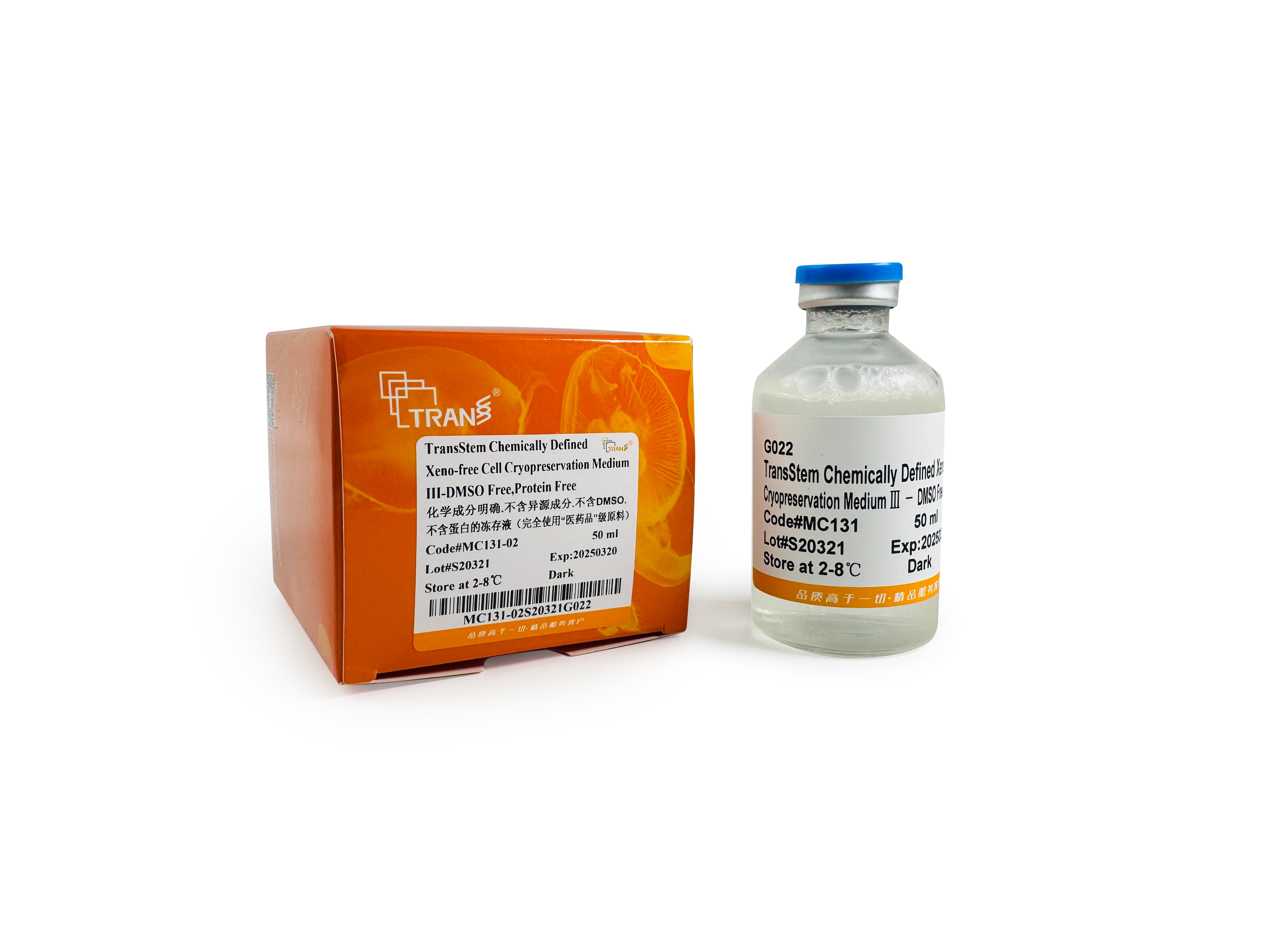 TransStem? Chemically Defined Xeno-free Cell Cryopreservation Medium III—DMSO Free,Protein Free 是一種化學(xué)成分明確、無動(dòng)物源性成分、不含二甲基亞砜(DMSO) 、不含蛋白成分、完全使用“醫(yī)藥品”級(jí)原料的即用型細(xì)胞凍存液。該產(chǎn)品已完成毒性實(shí)驗(yàn),可用作細(xì)胞藥物的藥用輔料,通用于各種細(xì)胞類型,包括間充質(zhì)干細(xì)胞,淋巴細(xì)胞等。該產(chǎn)品穩(wěn)定性好,能有效提高各類細(xì)胞復(fù)蘇活率。使用該產(chǎn)品凍存細(xì)胞可直接存放于-80℃冰箱凍存,無需經(jīng)過費(fèi)時(shí)的程序降溫過程。