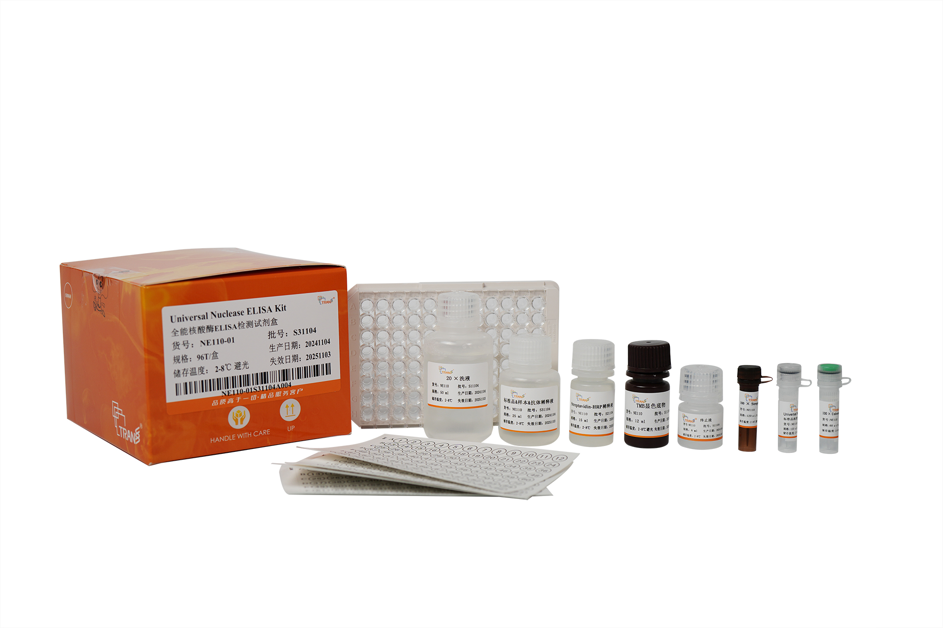 本試劑盒采用雙抗體夾心ELISA法定量測定生物制品中Universal Nuclease的殘留量。本試劑盒采用高親和力的Universal Nuclease抗體預(yù)包被酶標(biāo)板,將標(biāo)準(zhǔn)品/待測樣本和生物素標(biāo)記的抗Universal Nuclease檢測抗體同步加入微板孔中,經(jīng)過孵育后樣本中存在的Universal Nuclease會與酶標(biāo)板上的預(yù)包被抗體及檢測抗體特異性結(jié)合。洗滌去除未結(jié)合物后,將辣根過氧化物酶標(biāo)記的鏈霉親和素(Streptavidin-HRP)加至微孔板中并孵育,通過檢測抗體上的生物素和鏈霉親和素發(fā)生的高強(qiáng)度非共價結(jié)合,形成“包被抗體- Universal Nuclease蛋白-檢測抗體-Streptavidin-HRP”免疫復(fù)合物。再次洗滌后,將顯色底物TMB加至微板孔中,HRP會催化TMB底物生成藍(lán)色產(chǎn)物,顏色反應(yīng)的深淺將與樣本中Universal Nuclease的濃度成正相關(guān)。而后加入終止液終止反應(yīng),在450 nm波長(參考波長570 - 630 nm)處測定吸光度值。通過繪制標(biāo)準(zhǔn)曲線,由樣本吸光度值可計算出樣本中所含Universal Nuclease濃度。本試劑盒特異性強(qiáng)、檢測靈敏度高,同時操作更加便捷。